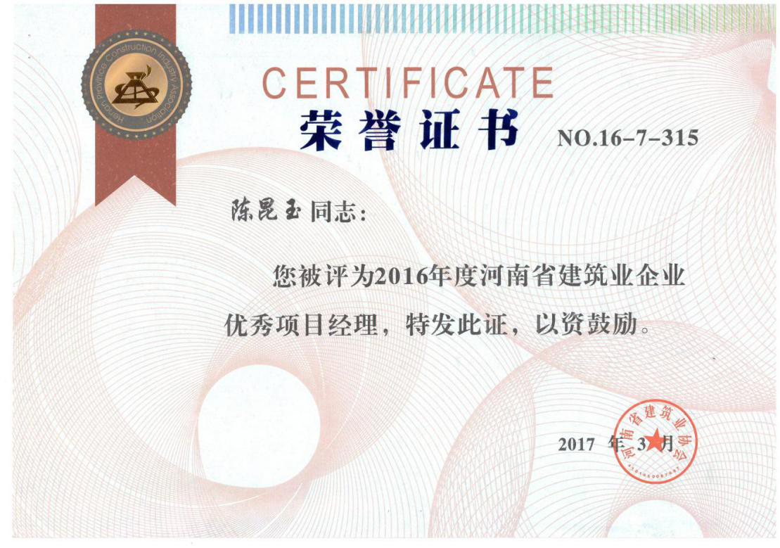 公司總經(jīng)理李寶峰被評(píng)為“河南省建筑業(yè)**企業(yè)家”,項(xiàng)目經(jīng)理:劉生軍、陳昆玉、李保峰3人被評(píng)為“河南省建筑業(yè)**項(xiàng)目經(jīng)理”。